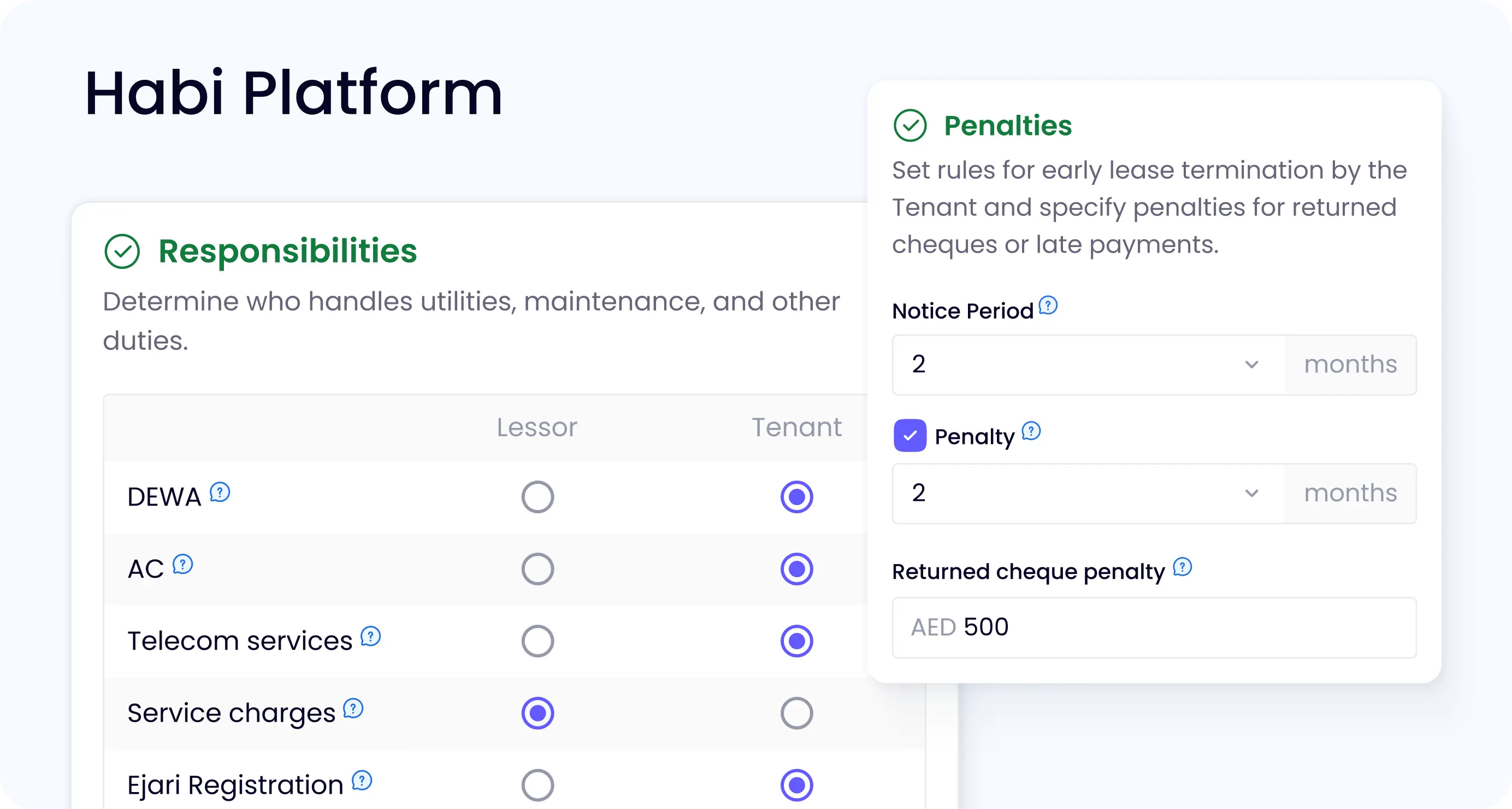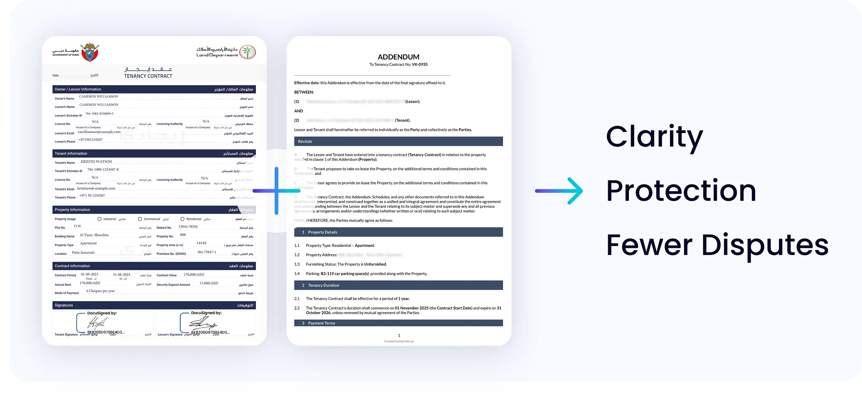 You can generate fully compliant long-term rental contracts and detailed addendums yourself, without requiring intermediaries or specialised legal knowledge, ensuring your documents are legally correct and designed to protect against disputes. The entire process is facilitated with digital signatures for both parties from any device. As an officially licensed entity in Dubai authorised for Ejari registration, Habi guarantees that all created documents are fully RERA-compliant and accepted by all relevant authorities.